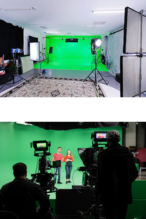 Green screens are neon green backdrops (but sometimes blue or other colors) that range from cloth to paper to green paint. In post-production the screen can be keyed out and replaced with any background. We can transform the actor(s0 to any location in the world in a matter of minutes, just by changing the background.